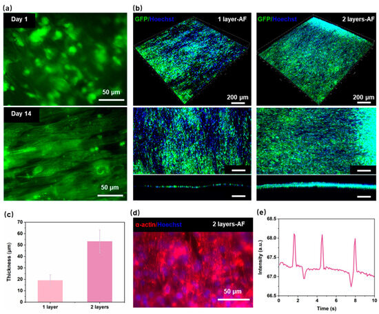 Performance of myocardial tissue on the HOC. (a) Fluorescence image of PCL nanofibers with hiPSC-CMs on day 1 and day 14. (b) Fluorescence image of the myocardial tissue on 1-layer AF and 2-layer AF. (c) The thickness of the myocardial tissue on 1-layer AF and 2-layer AF. (d) Fluorescence image of the α-actinin on 2-layer AF. (e) The contraction frequency of the myocardial tissue on 2-layer AF.