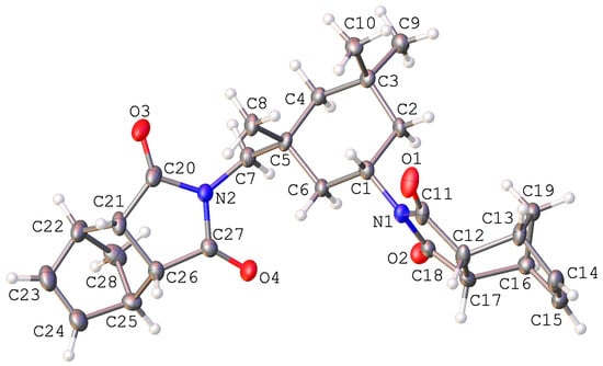 To obtain cross-linked polymers via ROMP, in this work we used bifunctional monomers representing norbornene derivatives bearing two norbornene moieties, which can be involved in the polymerization process independently. The norbornene-type bifunctional monomers were bis(nadimides) based on hexamethylenediamine (NB6), decamethylenediamine (NB10), and 1R,3S-isophoronediamine (NBI, Scheme 1). These diamines are commercially available and widely used in the synthesis of various polyamides, polyurethanes, and polyimides. Two nadimides, NB6 and NB10, were synthesized from cis-5-norbornene-exo-2,3-dicarboxylic anhydride (NDA, Scheme 1) following published procedures [47,48]. The reactions were carried out in toluene, and the products were purified via recrystallization from methanol or a methanol-chloroform mixture. The third nadimide, NBI, was synthesized under similar conditions using 1R,3S-isophoronediamine and isolated in pure form as a white solid with high Tm. This bifunctional monomer was characterized via 1H and 13C NMR spectroscopy and mass spectrometry. The structure and absolute configuration of stereocenters in the NBI molecule were also confirmed via X-ray analysis (Figure 2).