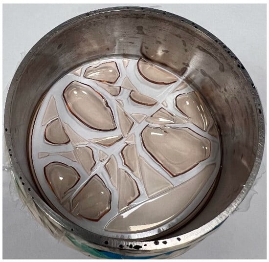 Then, we succeeded in fabricating transparent thin films based on the three cross-linked copolymers of NBpin and each bifunctional cross-linking agent via solution casting. The films’ pre- and post-methanol treatment images are shown in Figure 4. The films are insoluble and highly stable, do not swell in many organic solvents (Table 1), and have good mechanical properties (Table 2). In particular, reversible bending of the films is possible. It is noteworthy that if the content of the cross-linking agent in the comonomer mixtures exceeded 20 mol.%, the polymer films were usually brittle and spontaneously cracked upon solvent evaporation from the reaction mixture (Figure 5).