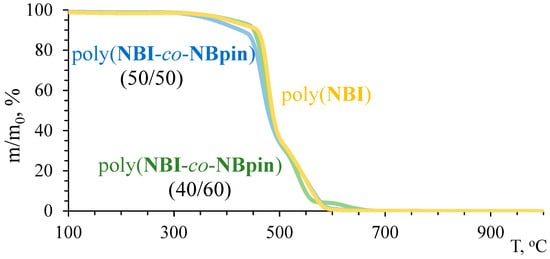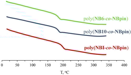 According to DSC data, all homo- and copolymers we have synthesized are glassy. The glass transition temperatures of the homopolymers of NBI, NB6, and NB10 are above 270 °C and decrease as the linker elongates (Table 2). The glass transition temperatures of the copolymers of NBpin and bifunctional comonomers depend on the nature of the cross-linking agent. For instance, consider the copolymers containing NBpin (90 mol.%) and 10 mol.% of the cross-linking agent. As shown in Figure 6, their glass transition temperatures drop from 197 °C for poly(NBpin-co-NBI) to 186 °C for poly(NBpin-co-NB10). Interestingly, the glass transition temperature of the metathesis homopolymer based on NBpin (poly(NBpin)) is 188 °C [41], i.e., the introduction of the cross-linking agent has no effect or only slightly increases the glass transition temperature of the synthesized cross-linked polymer, which is determined by the flexibility and length of the linker in the bifunctional comonomer.