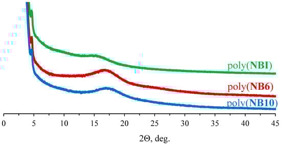 The amorphous nature of the metathesis homo- and copolymers under study was additionally confirmed by powder XRD (Figure 7, Table 3). The corresponding powder XRD patterns exhibit single broad peaks. Peaks in the powder XRD patterns of the homopolymers of NB10, NB6, and NBI are shifted toward smaller 2θ values, thus indicating an increase in corresponding d-spacings that correlate with the inter-chain distances in the polymer. For instance, the d-spacing is 5.1 Å for poly(NB10), 5.3 Å for poly(NB6), and 5.8 Å for poly(NBI). Thus, the longer and more flexible the linker, the closer the packing of polymer chains.