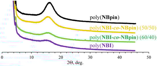 Peaks in the powder XRD patterns of the copolymers of the bifunctional monomers under study and the monofunctional comonomer NBpin are observed between the 2θ values for the peaks of the corresponding homopolymers (poly(NBpin) and the homopolymer of the bifunctional monomer (see Figure 8 and Table 4)). The peak position is determined by the composition of the copolymer and is shifted to that homopolymer whose content in the copolymer increases. In turn, large d-spacings may indicate a looser packing of polymer chains. However, this is not true in all cases, even for the same series of structurally similar polymers.