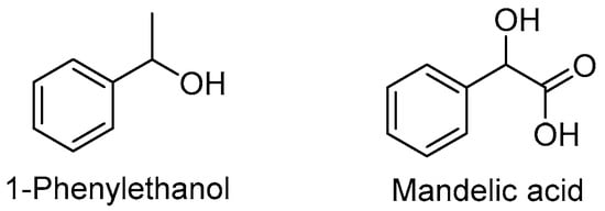 Permeation of organic compounds through the fabricated membranes was studied using the setup shown in Figure 1 in three media, viz., methanol, hexane, and an acetone:methanol mixture (4:1 v/v), taking 1-phenylethanol and mandelic acid (Figure 11) as examples. Molecules of the test compounds contain a hydroxyl and a carboxyl functional group, respectively. The choice of these molecules is due to their availability, the presence of functional groups present in many pharmaceutically active compounds, and the possibility to evaluate the effect of the presence of functional groups of a different nature on permeability. The effective surface area of the membrane was ca. 2.0 cm2, and the membrane thickness was mostly in the range of 77–97 µm. The concentration of the racemic organic compound in the feed solution was 0.01 M.