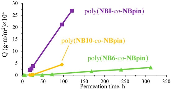 The nature of the cross-linking agent is the next factor that has a strong effect on the permeability of the cross-linked metathesis polynorbornenes. A comparison of the permeation fluxes of 1-phenylethanol through the films under study demonstrated that the longer the spacer in the cross-linking agent, the more permeable the synthesized cross-linked copolymers (Figure 12 and Figure 13). A possible explanation is as follows: the longer the linker, the higher the mobility of the main polymer chains (this is indirectly confirmed by DSC data) and thus the lower the energy barrier to diffusion of the penetrant molecules. The highest permeability was observed for the copolymers of NBpin and NBI (Figure 12). The permeation flux of 1-phenylethanol through poly(NBpin-co-NBI) in hexane was nearly five times higher than through the film based on poly(NBpin-co-NB10). This is most likely due to the more rigid structure of the cyclic spacer compared to the polymethylene one. Like the long length, the high rigidity of the spacer provides longer inter-chain distances, and probably, the more branched structure of the hydrocarbon linker additionally favors a higher degree of swelling of the copolymer in the related hydrocarbon solvent, hexane.