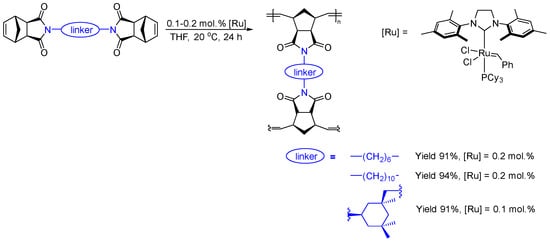 General procedure 2. To a diimide solution (0.2 mmol, 500 eq.) in THF (2 mL), the second-generation Grubbs catalyst (1.7 mg, 4 × 10−4 mmol, 1 eq.) in THF (0.5 mL) was added in an inert atmosphere, and the mixture was stirred at 20 °C for 24 h. Then, ethyl vinyl ether (0.2 mL) was added to the reaction mixture to complete the polymerization reaction. The polymer thus obtained was purified with methanol using a Soxlet apparatus.