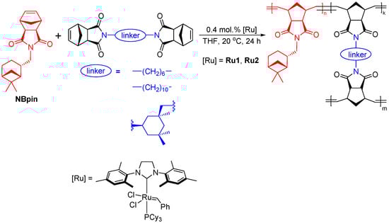 - Wolf, W.J.; Lin, T.-P.; Grubbs, R.H. Examining the Effects of Monomer and Catalyst Structure on the Mechanism of Ruthenium-Catalyzed Ring-Opening Metathesis Polymerization. J. Am. Chem. Soc. 2019, 141, 17796–17808. [Google Scholar] [CrossRef]