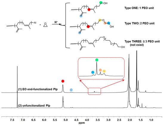 Top: Reaction scheme for end functionalization of PIP by EO; bottom: 1H NMR of (1) EO end-functionalized PIp and (2) unfunctionalized PIp.