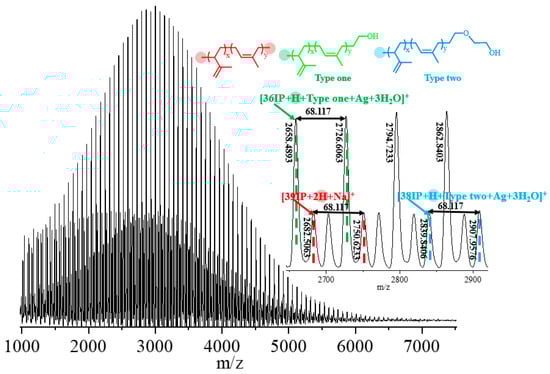 The prepared EO end-functionalized polyisoprene was characterized by an MALDI-TOF analysis. As shown in the spectrum in Figure 4, Type ONE can be clearly observed, with a small amount of Type TWO and being unfunctionalized PIp. Taking the peak of Type ONE (green) at 2727.2578 m/z as an example, it corresponded to 37 isoprene units (37 × 68.117 u) + the hydrogen of the α-end group (1.01 u) + the counterion Ag (106.91 u) + the Type ONE end group (45.0340 u) + 3 H2O in the system (3 × 18.0152 u). The small peak labeled with blue is the functionalized polyisoprene chain of Type TWO. The peak at 2839.4462 m/z corresponds to 38 isoprene units (38 × 68.117 u) + the hydrogen of the α-end group (1.01 u) + the counterion Ag (106.91 u) + the Type TWO end group (89.0603 u). The red-labeled small peak represents a small amount of unfunctionalized polyisoprene chain. The peak at m/z of 2681.6063 corresponds to 39 isoprene units (38 × 68.117 u) + the hydrogen of α- and ω-end groups (2 × 1.01 u) + the counterion Na (22.9898 u).