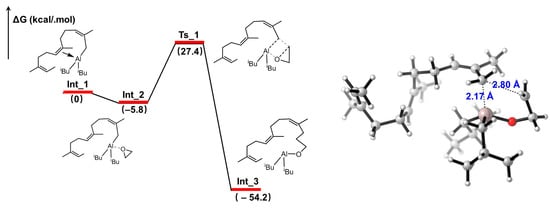 The end-functionalization process of Al-capped polyisoprene by EO was also analyzed using density functional theory (DFT) studies. In such a study, intermediate Int_1 bearing three polyisoprene units was established to model the Al-capped active species. It was found that, after the EO molecule coordinated to Int_1 to give Int_2 (Figure 5 (left)), an energy barrier of 33.3 kcal/mol was required to be overcome to open the ring of the EO monomer, and this process proceeded via a five-membered transition state of Ts_1, as shown in Figure 5 (right). At the end of the reaction, aluminum alkoxide species Int_3 was generated, which could subsequently give rise to the corresponding hydroxyl group in the presence of acidic protons. Additionally, the overall insertion step was highly thermodynamically favorable, as concluded from the energy decrement of −54.2 kcal/mol, implying the high reactivity of EO with Al-capped polyisoprenyl chain ends, which also agreed well with the high end functionalization efficiency obtained above.