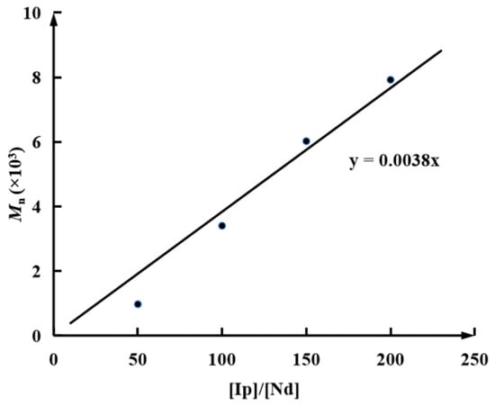 After establishing the basic reaction chemistry between the Al-capped polyisoprenyl chain and EO, studies were then expanded to polymerization at higher [Ip]/[Nd] ratios of 100, 150, and 200 wherein the concentration of Al-capped chain ends would be relatively lower. Nevertheless, it was found that such decreased concentrations of the active species posed a negative influence on their reactions with EO, giving gradually decreased end functionalization efficiencies ranging from 92.7% to 74.2%. When [Ip]/[Nd] ratios of 150 and 200 were applied to the system, the high viscosities of these reaction systems slowed down the reaction of the Al-capped chain ends with the EO molecule, giving very low functionalization efficiencies (Table 1, entries 3–4). Regarding the other parameters of the PIp products, their molecular weights showed a good linear relationship with the [Ip]/[Nd] ratios (Figure 6), and a gradually increased molecular weight was observed when increasing the [Ip]/[Nd] ratios, which was consistent with other CCTP systems. Such well-controlled behavior also manifested the superiority of end functionalization for a CCTP system versus other functionalization strategies, e.g., in-chain functionalization via a copolymerization manner wherein deactivated active species as well as ill-controlled performances are often observed [54,55,56].