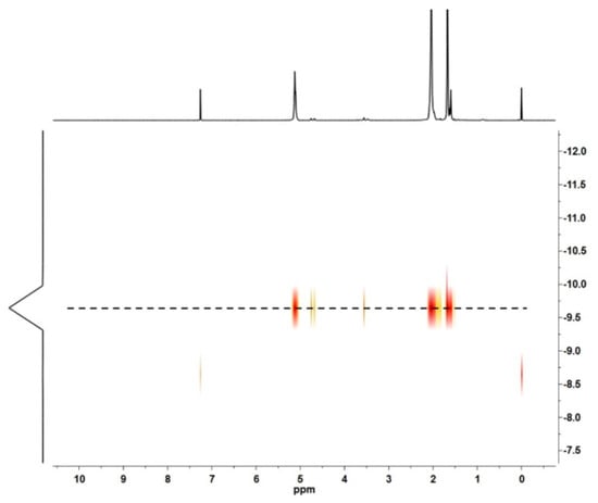 The content of polar PEO ends could be varied by feeding more EO monomers into the CCTP system in situ. When increasing the [EO]/[Nd+Al] ratio from 2 to 4 and to 8, the intensities of the resonance peaks at 3.43–3.78 ppm, which were assigned to the -OCH2- protons, were clearly increased (Figure 7a), implying that the PEO contents gradually increased. A two-dimensional DOSY NMR experiment could exclude the formation of PEO homopolymers, because otherwise, two diffusion coefficients would be observed (Figure 8). Additionally, the increased polar PEO segments could obviously improve the surface properties of the resultant polymers, as revealed from the significantly decreased static water contact angles ranging from 95.0° to 74.9° (Figure 7b).