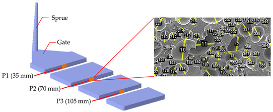 The molded parts were analyzed at three locations: P1 (front position close to the gate), P2 (position in the middle of the part), and P3 (back position far from the gate). Using the SEM image of the cell structure, the cell diameter (also known as the cell size) was measured, assuming that the cell was perfectly round. Cell diameter measurements were made on the core part of each image using ImageJ 1.54f software. To determine the cell density of a microcellular injection-molded part, Kumar and Suh [29] formulated the following equation: