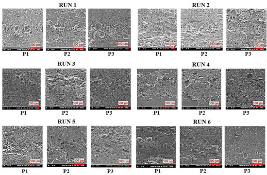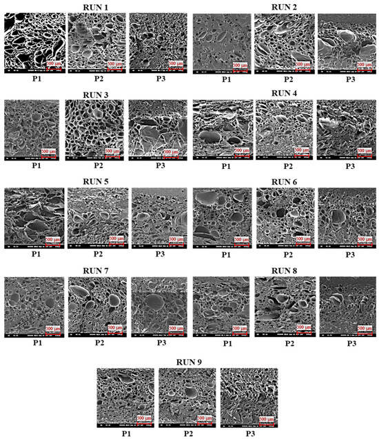 The SEM images (Figure 3) of the molded parts from each run in the first stage of the experiment were analyzed using ImageJ 1.54f software to measure the cell sizes.