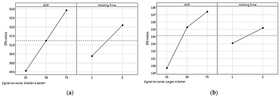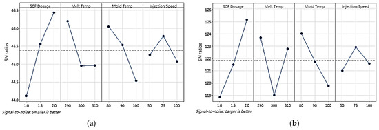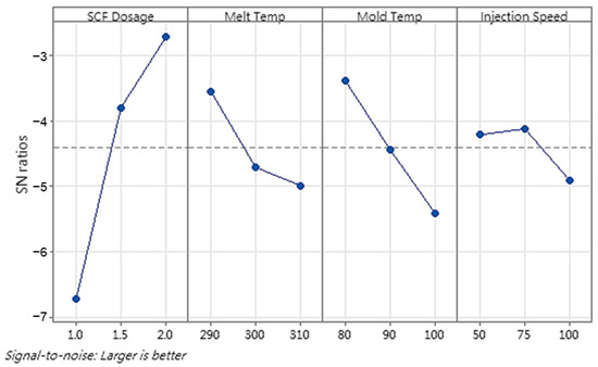 The Minitab version 21 software only analyzes the cell size and density as individual responses because in the cell size analysis, the “smaller is better” response is used. However, in the cell density analysis, the “larger is better” response is used. Based on the data processing results, the parts with small cells did not necessarily have high cell densities (as shown in runs 8–9, Figure 4), and differing trends were observed in the influence of the processing parameters on the cell size and density with respect to melt temperature and injection speed. Thus, to determine the influence and optimum combination of the processing parameters for both responses, GRA was employed with six responses, namely the cell size and density at P1, P2, and P3. Table 6 lists the GRG calculation results. The GRA results showed that run 8 was the best for all responses, with the highest GRG rank. To confirm that the selected run was optimal, a Taguchi design analysis was conducted again for the GRG values using Minitab version 21. Figure 6 shows the main-effects plot of the S/N ratios for the GRG values, which indicates that the optimal combination of processing parameters was an SCF dosage of 2%, a melt temperature of 290 °C, a mold temperature of 80 °C, and an injection speed of 75 mm/s.