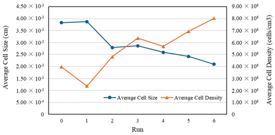 Based on the SEM images in Figure 9, the average cell size and density calculation results for each measurement position in the second stage of the experiment are summarized in Table 10. Figure 10 shows the average cell size and density in each experimental run, including the best optimum run from the first stage (designated as run 0). Obviously, the employment of gas counter pressure and optimization of the gas holding time improve the foaming quality (i.e., decreasing the foaming cell size and increasing the cell density) significantly.
