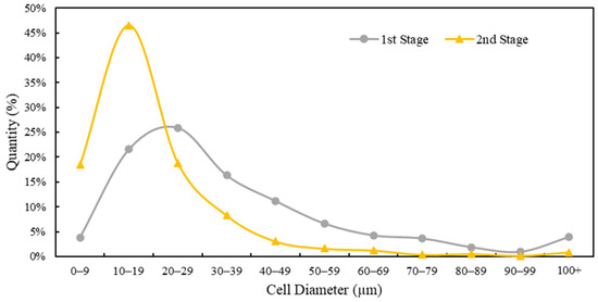 The implementation of GCP improved the uniformity of the cells of the molded part according to a narrower cell size distribution. Figure 12 shows an overall comparison of the cell size distribution from the optimum results of the first and second stages of the experiments. The proportion of cells smaller than 20 µm drastically increased from 26% in the first stage to 64% in the second stage, indicating a 146% improvement. Additionally, 91% of the cells in the second stage were smaller than 40 µm, compared with only 68% in the first stage. This shift toward smaller cell sizes, with fewer larger cells (e.g., cells larger than 100 µm decreased from 4% to 1%), suggested that the microcellular structure was effectively refined by the GCP. The improved uniformity and reduced cell size distribution complemented the contributions of the GCP to the improved surface quality and overall stability of the material. This highlights the importance of the GCP in achieving higher quality and consistency in molded parts.