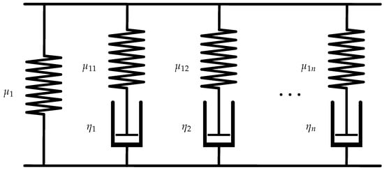 The viscoelastic material model is based on a continuum mechanical description motivated by a rheological model. Rheological models are described by combining the spring element with the Maxwell element in parallel to model relaxation behaviour. The discrete spectrum of relaxation time is considered by combining the spring element with several Maxwell elements as shown in Figure 1.