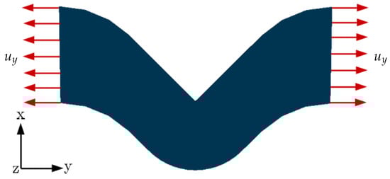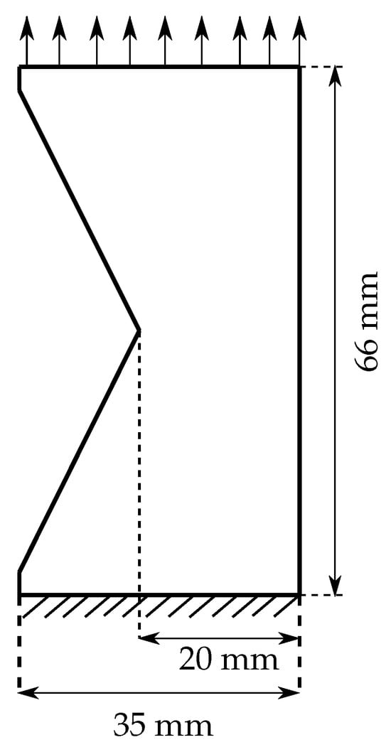 The phase-field damage model requires a finite element mesh to resolve the damage evolution and produce better numerical results; however, the solution with the refined mesh is computationally expensive. Therefore, a mesh sensitivity study is performed on the V-shaped notch specimen analogous to the angular specimen shown in Figure 4. The V-shaped notch specimen is applied with the tensile load boundary conditions (see Figure 5).
