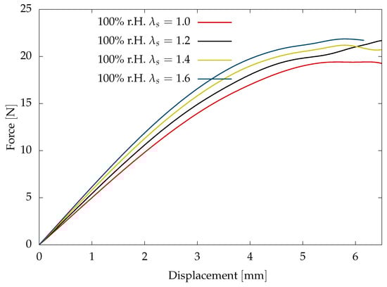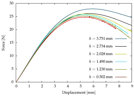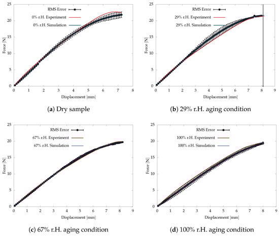 The force-displacement data from the simulation are compared with the experimental test data to validate the identified optimal material parameters. The test used in the comparison is the mean value calculated from the series of three angular test samples manufactured at the same atmospheric conditions [67].