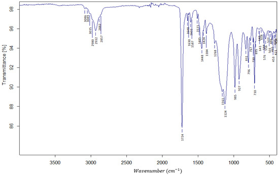 In Figure 1, the exemplary FTIR spectrum is shown. It confirms the presence of ester bonds with a sharp and strong peak at 1724 cm−1 ascribed to the stretching of the C=O bond. In the fingerprint region, the proof of the existence of the m- and p-substituted phenyl ring from the DVB crosslinker is seen. Stretching of the v (H-C=C) bond is shown as a medium strength peak at 2932 cm−1. Stretching of v (-C=CH2) is giving a weak peak at 1648 cm−1.