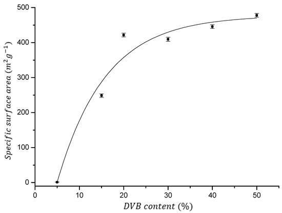 Specific surface area as a function of DVB content. Fit with an exponential function (r2 > 0.95).