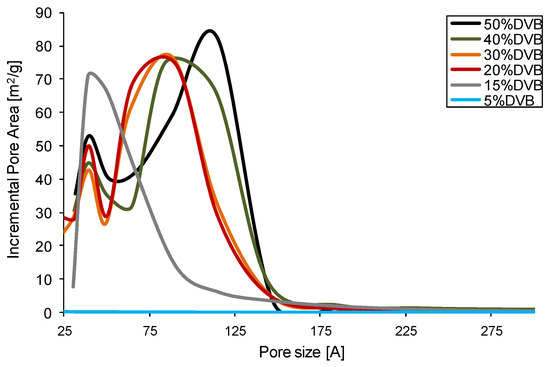 As can be seen in Figure 4, the crosslinked polymers with DVB content of 20% and higher display a bimodal contribution of pores to the specific surface area. One set of pores has a diameter between 3 and 5 nm, and the second set of pores contributing to the specific surface area is between 7 and 11 nm, with resin number 1 having the biggest shift to the higher diameter. Monomodal distribution of pores can be seen only for resin 5 with 15% of DVB, for which the decreased specific surface area is observed as well. Finally, resin 6 is non-porous, showing only traces of a specific surface area.
