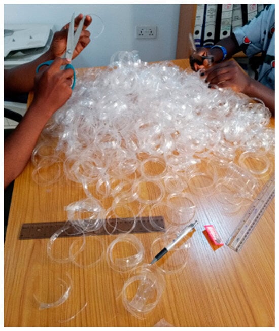 The materials used for this study were the lateritic soil sample and shredded plastics. The soil used in this research was obtained from Federal Capital Abuja (Guzape District, Nigeria). The stabilizer used in this research was shredded plastics obtained from PET bottles, as shown in Figure 1. The dimensions of the shredded PET strips used for this study are 10 × 50 mm. Clean water was used for the mixing of the lateritic soil and the shredded plastic waste.