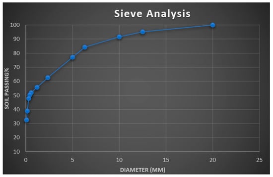 The proportions of the different particle sizes that a soil contains are expressed by its particle size distribution. The relative weights of certain size classes or the relative numbers of particles within particular size classes are used to describe the proportions. The sieve analysis test was carried out in compliance with [].
