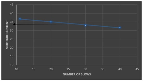 The graph in Figure 4 reflects the relationship between the moisture content and the number of blows. The liquid limit of the soil material used in the experiment was obtained at 25 blows. The liquid limit of the soil material used is 34%.