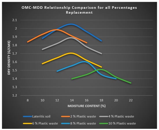The result presented in Figure 5 revealed that the optimum moisture content (OMC) of 14% and maximum dry density (MDD) of 2.05 g/cm3 were obtained for the lateritic soil used with 0% of plastic waste fibre. There is a reduction in the value of OMC to 12% and that of MDD to 1.985 g/cm3 of the lateritized plastic containing 2% plastic waste fibre. This reduction is due to resulting permeability and capillary action of the composite material with the addition of plastic waste fibre. As the percentage of plastic waste fibre increases to 4%, the value of OMC increases to 14% due to more space being occupied by the plastic waste fibre, on which moisture stays on the surfaces of the plastic fibre. However, the MDD further decreases to 1.888 g/cm3 due to the increase in the proportion of the shredded plastic waste. The value of OMC remains unchanged as the plastic waste fibre content increases from 4% to 6% in the lateritized plastic. However, the MDD was found to further decrease to 1.705 g/cm3. As the percentage of plastic waste fibre increased to 8% in the composite (lateritized plastic), the OMC increased to 16% while the MDD decreased to 1.600 g/cm3 as the lighter plastic waste proportion increased. The OMC, as presented in Figure 5, was achieved at 18%, as plastic waste fibre increased to 10% and a reduced maximum dry density of 1.510 g/cm3 was obtained due to the light weight of the shredded plastic waste. The reduced soil density is used in engineering to build lightweight embankments. The more the shredded plastic waste is added to the lateritized plastic, the lighter the resulting composite. This kind of composite is appropriate for applications requiring a lower maximum dry density [].
