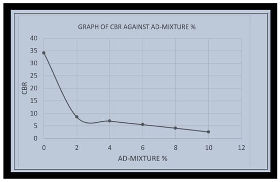 The CBR of various samples of lateritic soil and composite material of shredded plastic waste bottle of various percentage of 0%, 2%, 4%, 6%, 8%, and 10% by weight were tested, and the results of the CBR of lateritic soil with zero percent and different percentage of plastic waste fibre are presented in Figure 6. The CBR of lateritic soil with zero percent plastic waste fibre was 34.1, which was achieved by consolidation, serving as a reference for various percentages of the admixture of the plastic waste fibre used in the experiment. The CBR reduced to 8.5, 6.9, 5.5, and 4.1 with the addition of 2%, 4%, 6%, and 8% of plastic waste fibre admixture, respectively, due to the presence of the admixture that reduce the penetration of the plunger. The results presented in Figure 6 show that the addition of the 10% plastic waste fibre admixture resulted in a reduced penetration of the plunger, leading to a further reduction in the CBR value to 2.6.