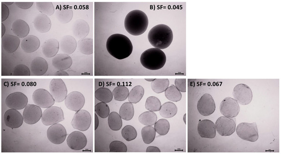 Biomass immobilized in alginate and chitosan capsules and alginate–chitosan composites prepared with chitosan solubilized at pH 3.8 (Stereomicroscope, Zeiss SB8; 6.4×). (A) Calcium alginate, (B) chitosan, (C) blended composites, (D) coated composites, and (E) core-shell composites. SF is the sphericity factor.