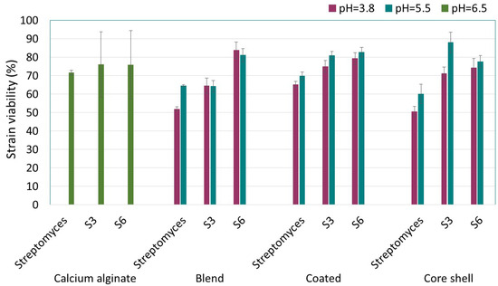 Viability (%) of actinomycetes after encapsulation in alginate–chitosan composites. Three-way ANOVA with data segmented by polymeric matrix type. According to the Tukey test for α < 0.05, viability is determined by strain type and pH.