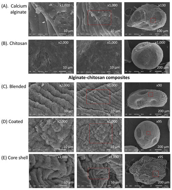 SEM images in Figure 3 depict dehydrated capsules (using an airflow rate of 10 L min−1) of calcium alginate, chitosan, and three alginate–chitosan composites: blend, coated, and core-shell. Both alginate and chitosan capsules displayed a rough surface texture, with deeper channels observed particularly in the alginate capsules. In the composites, surface morphology varied significantly depending on the preparation method. For example, blend and coated composites exhibited a rough surface with a criss-crossed reticular structure. In contrast, core-shell composites showed channels with multiple folds in an open structure characterized by long and deep grooves. This distinctive morphology is likely attributable to the penetration of chitosan into a soft reticular matrix of calcium alginate.