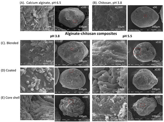 Regarding the dehydration of biopolymers, Conzatti et al. [58] reported that the dehydration method significantly influences the porosity of the dehydrated biopolymer. In the present study, where dehydration was carried out using an airflow method, the porosity of the encapsulates increased by 20% to 40% in the composites prepared with chitosan at pH 5.5. For composites prepared with chitosan at pH 3.8, significant changes in porosity (up to 20%) were only observed in the blended composites. Although the porosity of the coated composites at pH 5.5 increased by up to 40%, the microbial cells released from these composites exhibited the highest viability percentages.