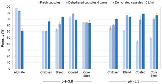 Porosity of fresh and dehydrated capsules of calcium alginate and chitosan, and their composites. The 3-way ANOVA of the polymeric matrix porosity revealed significant differences due to the polymeric matrix (F = 23.2, df = 3, p < 0.0001, χ2 = 0.720) and drying airflow (F = 30.36, df = 2, p < 0.0001, χ2 = 0.692).