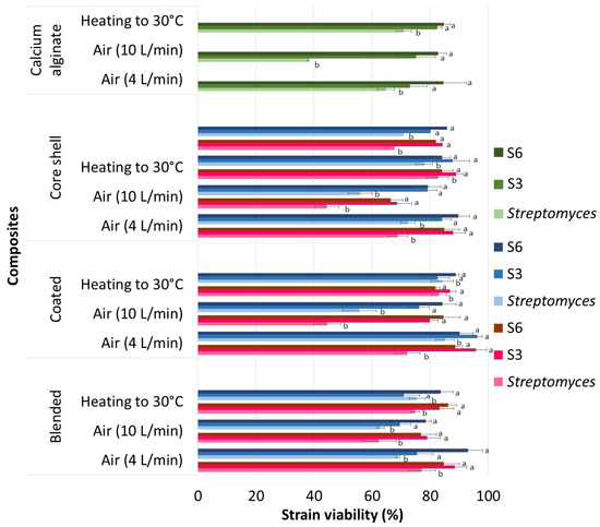 Dehydration of actinomycete strains immobilized in alginate–chitosan composites under two different air flows (4 and 10 L·min−1) and heat at 30 °C resulted in the viability percentages presented in Figure 7. ANOVA of the viability of the immobilized and dehydrated strains identified significant differences due to the type of composite (F = 3.274, df = 2, p = 0.044, χ2 = 0.094), strain (F = 40.429, df = 2, p < 0.001, χ2 = 0.562), drying airflow (F = 37.115, df = 2, p < 0.001, χ2 = 0.541), and the (strain)–(drying airflow) interaction (F = 8.581, df = 4, p < 0.001, χ2 = 0.353). The dependent variable met normality assumptions as verified by the Kolmogorov–Smirnov test. Strains immobilized in composites exhibited a higher average viability (11–15%) compared with those immobilized in calcium alginate alone. Among the strains, those isolated from agricultural soil (S3 and S6) were more resistant to the drying process, showing an average viability of 13%, a percentage higher than the collection strain (Streptomyces sp.). Air-drying at 10 L min−1 resulted in average viability losses 13% greater than the other two methods (airflow at 4 L min−1 and heat at 30 °C), between which no significant differences were observed. Chitosan solubilization in an acidic medium (pH 3.8) did not affect the viability of the encapsulated and dehydrated strains when the pH was increased to 5.5. However, compared with the sodium alginate encapsulating solution at pH 6.5, the lower viability in the calcium alginate is attributed to its less protective properties.