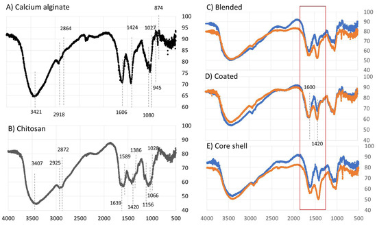 FTIR spectra of calcium alginate (A) and chitosan (B) capsules and their composites: blended (C), coated (D), and core shell (E), produced when the chitosan was solubilized at a pH of 3.8 (blue line) and 5.5 (orange line).