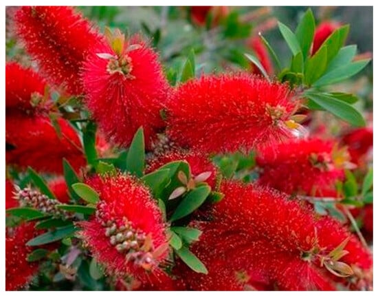 - Laganà, G.; Barreca, D.; Smeriglio, A.; Germanò, M.P.; D’Angelo, V.; Calderaro, A.; Bellocco, E.; Trombetta, D. Evaluation of Anthocyanin Profile, Antioxidant, Cytoprotective, and Anti-Angiogenic Properties of Callistemon citrinus Flowers. Plants 2020, 9, 1045. [Google Scholar] [CrossRef] [PubMed]