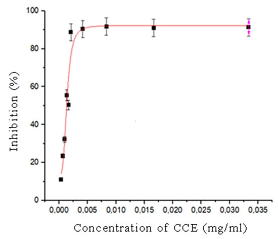 The antioxidant capacity of the CCE was assessed by measuring its DPPH (2,2-diphenyl-1-picrylhydrazyl) free radical scavenging activity []. Starting from a concentration of 1.0 µg/mL, different concentrations of aqueous CCE were tested in two separate batches (1.0, 0.5, 0.25, 0.12, and 0.06 mg/mL) and (0.05, 0.04, 0.03, 0.02, and 0.01 mg/mL). The IC50 (half-maximal inhibitory concentration) value of CCE was determined to be 0.0014 mg/mL ± 0.0001 (Figure 2), indicating that a very low concentration of CCE is required to achieve significant antioxidant activity. The result highlighted the potent antioxidant properties of CCE, as demonstrated by its ability to significantly reduce free radicals at minimal concentrations. This makes CCE a promising candidate for further studies related to its potential health benefits, particularly in preventing oxidative stress-related damage. Therefore, CCE could potentially be a valuable natural antioxidant in food, pharmaceutical, or cosmetic applications.