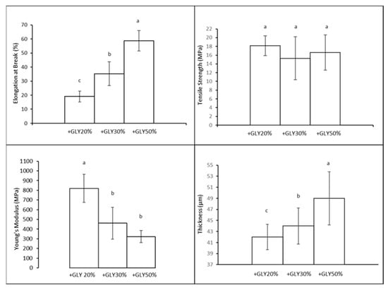 Mechanical properties and thickness of films produced with different concentrations of GLY (w/w of CH). Different lowercase letters (a–c) denote significant differences among the values reported in each bar (Duncan’s multiple range tests, p < 0.05).