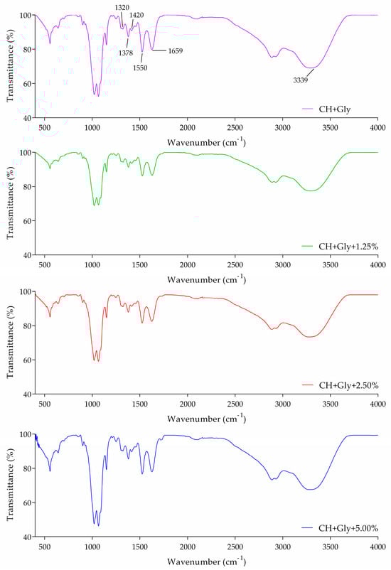 Figure 5 shows the Fourier-transform infrared spectroscopy (FTIR) spectra of films made from chitosan manufactured with glycerol and different percentages of CCE. The chitosan-based films detected characteristic bands at approximately 3339, 1659, 1550, 1320, 1420, and 1378 cm−1, which are attributed to the stretching vibration of N-H and O-H groups included in hydrogen bonds, the C=O stretching of amide I, the N-H bending of amide II, the C-N stretching of amide III, CH2 bending, and CH3 symmetrical deformations, respectively. Furthermore, the presence of an asymmetric stretching band of the C-O-C glycosidic bridge bond band centered around 1154 cm−1. The addition of CCE showed minor changes in the region 1500–1700 cm−1, ascribed to the characteristic stretching vibration of the ester carbonyl group of flavonoids. The inspection of the spectra also showed a dispersion of compounds present in CCE into the film’s matrix.
