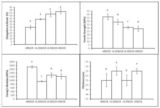 Mechanical properties and thickness of films obtained with different concentrations of Callistemon citrinus extract (CCE) (w/w of CH). Different lowercase letters (a–d) denote significant differences between the values shown in each bar (p < 0.05).