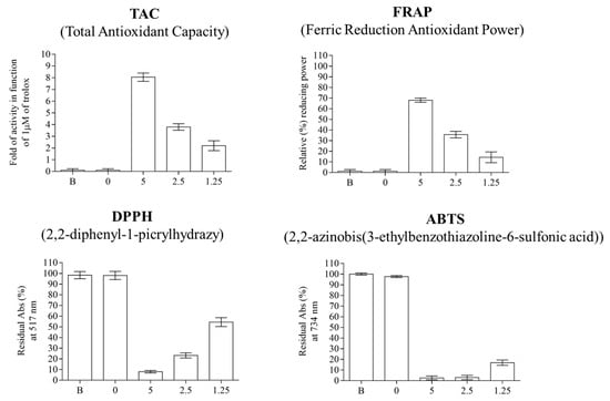 Effect of different percentages of CCE on antioxidant activity of bioplastics prepared with chitosan (CH, 2%) and GLY (30% w/w of CH) through TAC, FRAP, DPPH, and ABTS assays. (B: internal standard; 0: film control (CH + GLY); 5: film + 5% of CCE; 2.5: film + 2.5% of CCE; 1.25: film + 1.25% of CCE).