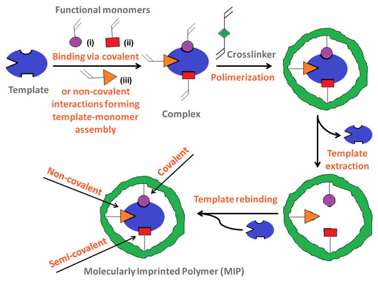 Schematic representation of the synthesis of an MIP by covalent, semi-covalent, and non-covalent bonds (adapted from [13]).