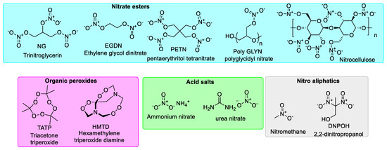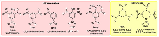 Explosives come in a variety of forms, and they can be divided into several groups based on their chemical structure (Figure 3). Nitroaromatic explosives, which are found in ammunition, have the potential to contaminate soil and groundwater [95]; they include examples such as TNT and TNP. High vapor pressure di-nitrotoluenes are found in blasting gelatin formulations, in gun/rocket propellants, and as contaminants in TNT manufacturing. Propellants, detonators, and plastic explosives are among the military uses for nitrate esters, many of which are liquids. Furthermore, plastic explosives also contain brisant explosives like HMX and RDX [96]. Organic peroxides that are sensitive to heat, shock, and friction are frequently utilized in homemade explosives for improvised explosive devices [97]. In addition to being employed as a blasting explosive, ammonium nitrate/fuel oil (ANFO) is also frequently utilized as fertilizer. ANFO and urea nitrate have been utilized in many improvised explosive devices [98], where aliphatic nitrates and fuel combinations can also be found [99].