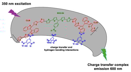 Fluorescence-based methods are some of the most preferred approaches for nitroaromatics trace detection due to their high sensitivity, good portability, the possibility for eco-friendly design, and simple utilization protocols. Since many nitroaromatics are non-fluorescent, detection performance is enhanced by using fluorescent sensory elements. The intensity (quenching or amplification), wavelength, anisotropy, or lifespan of the fluorescence changes in correlation with the concentration of the explosive target molecule and exposure duration. One of the important steps in designing new solutions for explosive traces detection based on fluorescence entails elucidation of the interaction mechanism between the fluorescent sensing materials and target molecules. The interaction can entail photoinduced electron transfer, resonance energy transfer, electron transfer, or intramolecular charge transfer processes [109]. The design of fluorophores with adequate response has received significant research attention, with examples including small molecules, nanoparticles (quantum dots), and conjugated polymers, which offer an effective electronic communication pathway between the quencher along the polymer chain. In this context, Huynh et al. [110] developed a chemosensor for picric acid determination using an imprinted polymer involving a recognition unit (NH2-S4) cross-linked to a fluorophore transducer (CLM) (Figure 4). The MIP-picric acid film was demonstrated to be a good chemosensor candidate material due to its emission in the visible range and excellent picric acid limit of detection (at the sub-nanogram per liter picric acid concentration, at least 0.2 ng/L picric acid). Additionally, the CLM component played a multiple role as a functional and cross-linking monomer as well as the fluorophore in this chemosensor. Thus, the CLM assures the stability of the MIP (crosslinking) the functional monomer with the formation of MIP cavities, while its fluorescence property allows signal registration and quantification [110].