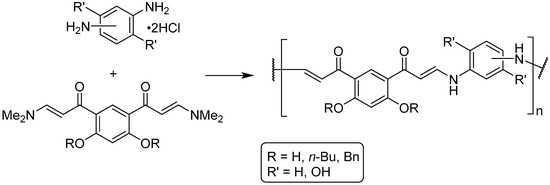 - Ueda, M.; Otaira, K.; Imai, Y. Synthesis of Polyenamines by Vinylogous Nucleophilic Substitution Polymerisation of 1,6-Diethoxy-1,5-hexadiene-3,4-dione with Diamines. J. Polym. Sci. Polym. Chem. Ed. 1978, 16, 2809–2815. [Google Scholar] [CrossRef]