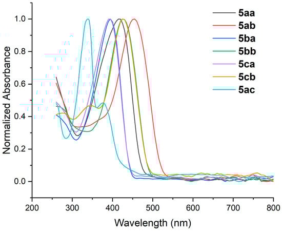 Normalized UV-vis spectra of compounds 5aa (▬), 5ab (▬), 5ba (▬), 5bb (▬), 5ca (▬), 5cb (▬), and 5ac (▬).