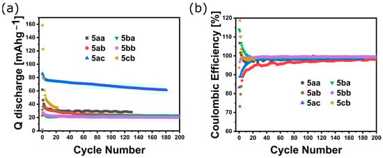 Specific capacity (a) and Coulombic efficiency (b) of the polymers 5aa, 5ab, 5ac, 5ba, 5bb, and 5cb.